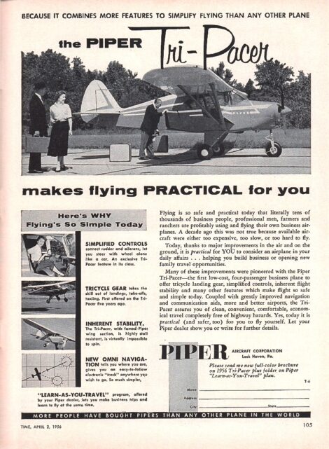 Since last September’s accident, the destroyed Tri-Pacer has remained up on blocks on the northern edge of the airport. That model of short-winged Piper went on sale in the 1950s and was pitched as a low-cost, four-passenger airplane that anyone could fly. An advertisement in Time Magazine in 1956 said—perhaps with dangerous overstatement—that its tricycle landing gear “takes the skill out of landings, take-offs, taxiing.” The plane offered “clean, convenient, comfortable, economical travel completely free of highway hazards,” as suggested by the advertisement.