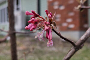 I scouted for more blooms opening in the landscape. My earliest Viburnum, Pink Dawn (Viburnum x bodnantense “Pink Dawn”) has blooms on the wood formed last year. This plant has been here for three years and is still young. I am hoping it takes off in 2025. I will fertilize it and make sure the soil stays moist. The blooms are so pretty in April. As soon as the blooms fade, I will trim back the stems to encourage more growth and flowers next year. I want this plant to put on a show in the future.