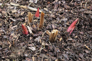 Also visible now are the red tips of peony plants. When you see these, you know your peony is planted at the proper depth. I always leave a little stem when cutting back the dead leaves in the fall so I know where to look in spring. Gently pull away any weeds or mulch from these emerging plant stems to give them light! Now that you know where they are, install your peony support hoops or grids. You can adjust the peony stems to stay within the supports as they grow and your gorgeous blooms won’t snap into the mud during heavy June rainstorms. That is a lazy gardener win!