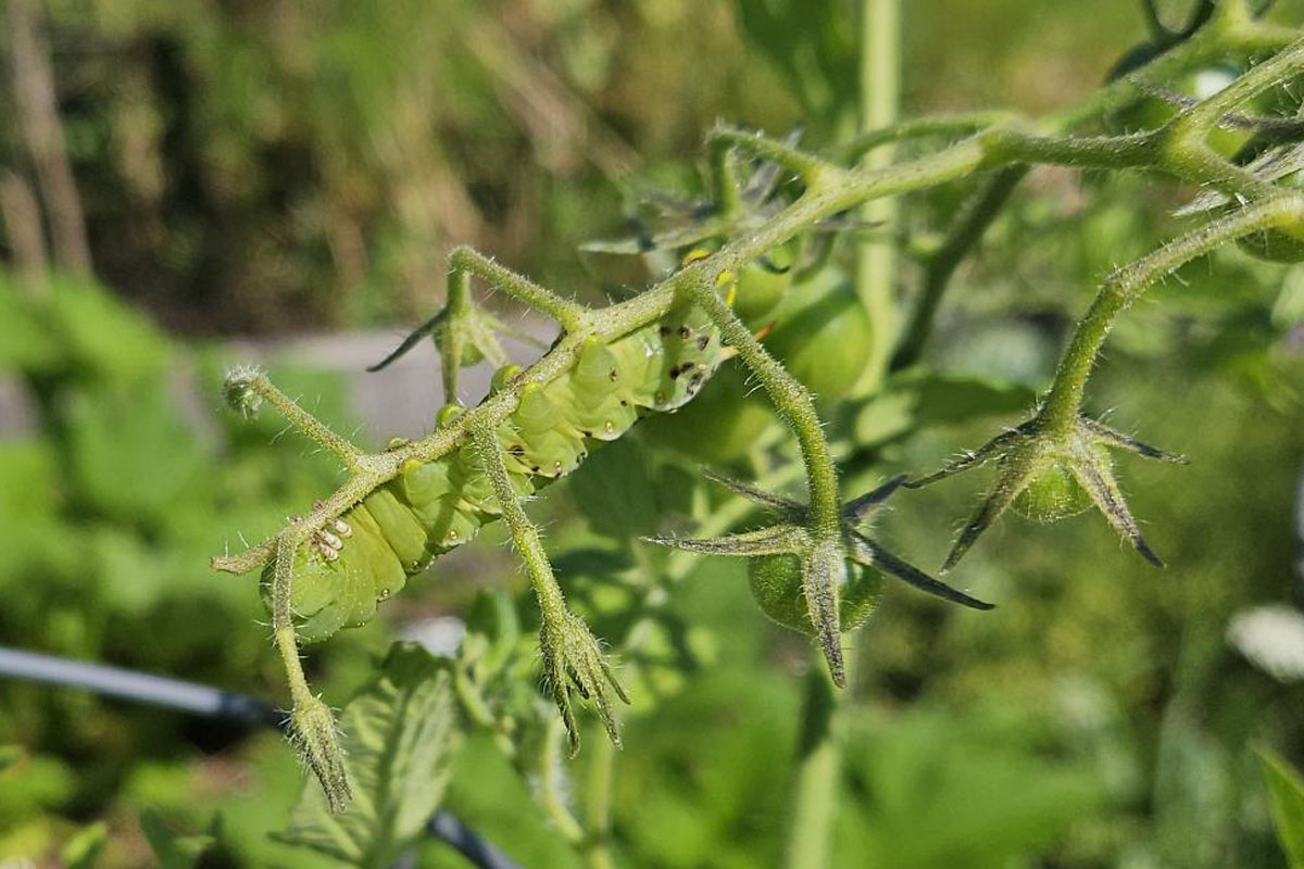 Once again this weekend, I let the water soak deeply into the tomato roots and stared at their tall vines looking for fruit and pests. And then I spotted it: a tomato hornworm. This one was not as large as last year’s pest but still about 2.5 inches long. The larvae of a sphinx moth (Manduca quinquemaculata) looks like a fat tomato stem or spent flowers on a stalk.