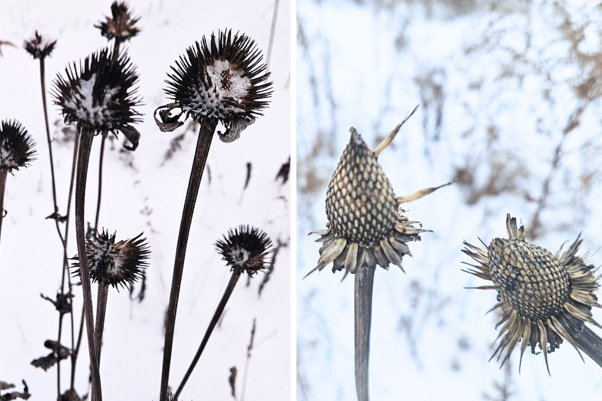 If adding trees eats up the budget, think about interesting perennials instead. Seedheads that persist through the winter to catch snow or create a break from too much “white” also add interest to your landscape. Coneflower (Echinacea sp.) has a spiky ball shape while the seeds linger, but a picked-over flower head has wonderful shape, too, that makes you realize where the term coneflower originates. The drumstick centers of black-eyed susans (Rudbeckia sp.) also create a great silhouette.