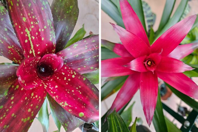 Ever so simple to water, you know it is time when their central cup, or tank, is empty. Fill the cup and they’re good for another week at least. In their natural habitat, bromeliads gather nutrients through special cells on their leaves that absorb rain and passing water that has dissolved organic materials and minerals. The leaves form the tank that also holds water and dissolves debris and insects to feed the plant.