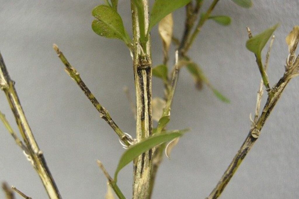 Boxwood blight may look like winter burn except that it occurs during the growing season and random branches are affected, not just one side. Twig stems with blight will have streaks of black. The blight develops from the leaf edges in hot, humid weather and gradually affects entire branches. Early detection and removal of infected plants is the best solution for now. Preventive fungicides on non-symptomatic plants would be a good idea. Images of different boxwood issues were also found on the Virginia Cooperative Extension website.