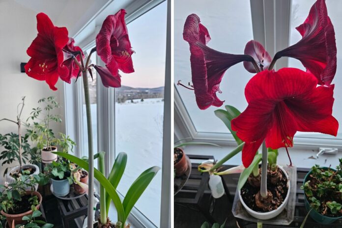 The last of my amaryllis bulbs that over-summered last year has a fourth bloom opening now. The stem must be 40 inches tall! Indoors is where the growing is happening.