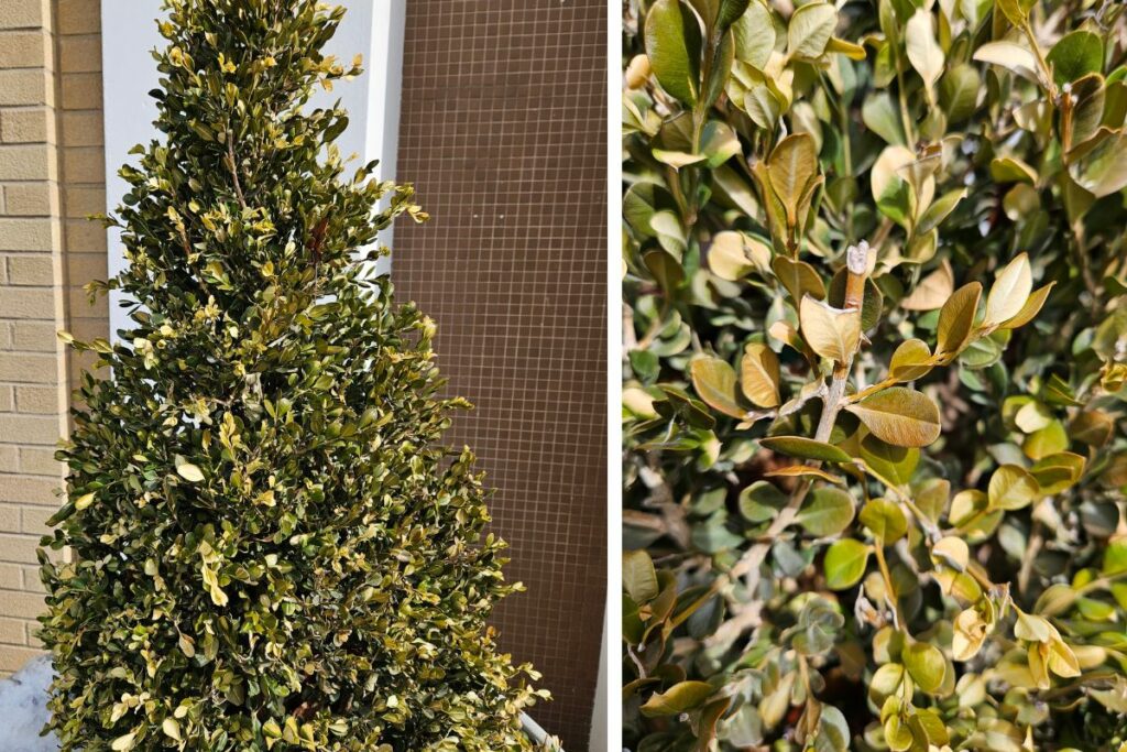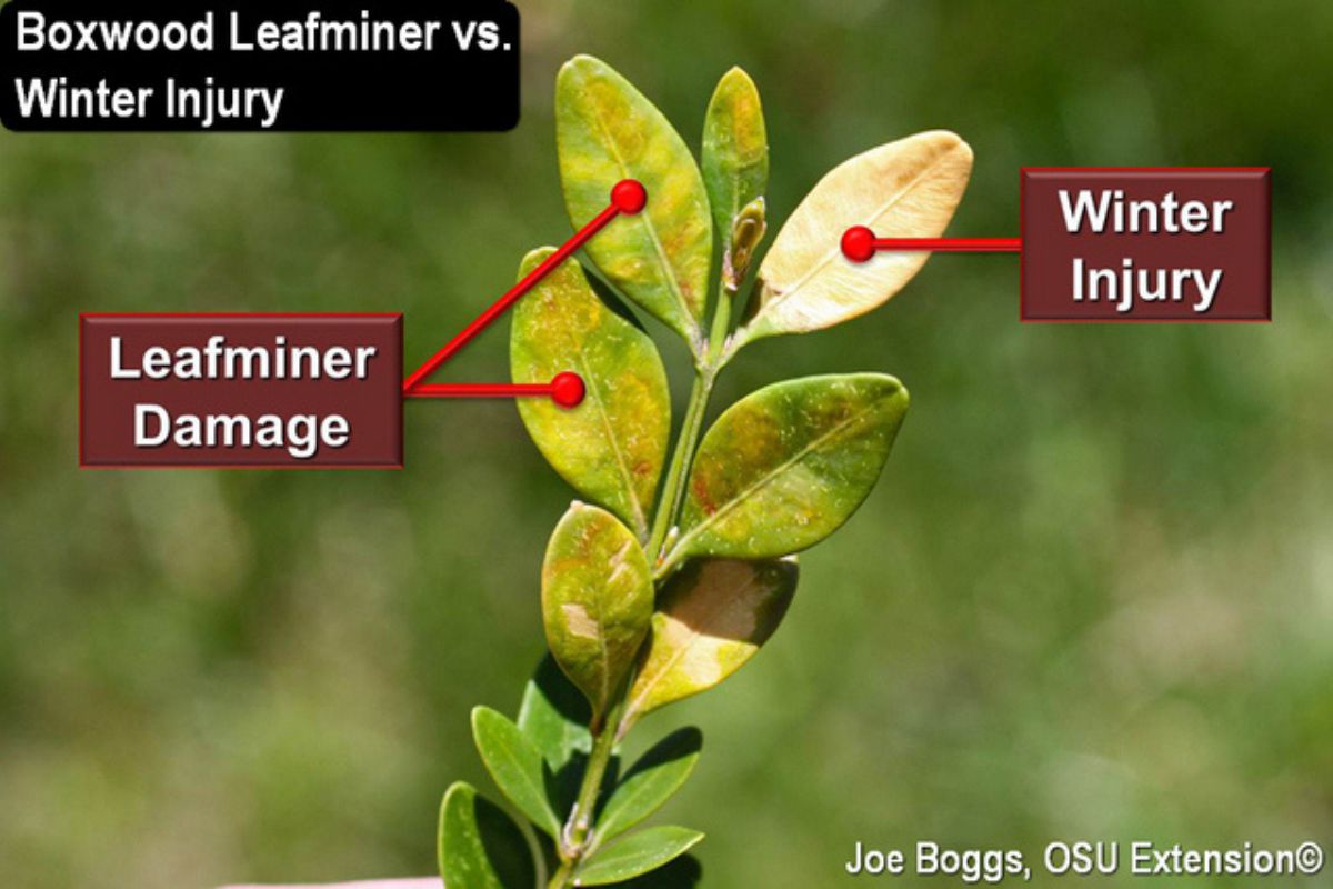 Boxwood may attract boxwood leafminer—the result of small flies laying eggs on the underside of boxwood foliage. From a distance, the damaged leaves might look similar to winter burn: either brown or yellowing. The pests create different damage patterns when you look closely at the leaves. The leafminers are insect larvae pests that tunnel between leaf layers and create yellow or brown circular spots or blisters on the leaf surfaces. Bad infestations of leafminers can be controlled with early spring pruning or appropriately timed pesticide applications.
