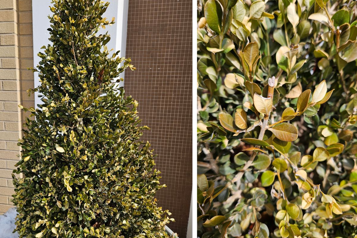 Winter burn on boxwood is the yellowing or browning of the leaves overall and usually will appear on one side of the shrub, primarily the side exposed to the harsh winter sunlight from snow or building reflections on the south or west sides. Damage can be pruned out early in the season, and the shrubs will fill in. To prevent future damage, wrap the shrubs with burlap or provide a windbreak in the late fall.