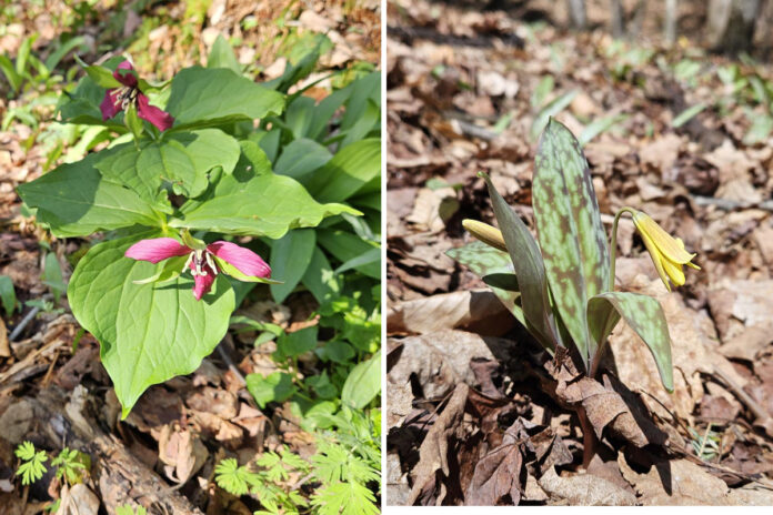 April showers bring May flowers—and April flowers! The trillium have opened in our woods, along with black cohosh and trout lily. Venture into your local woods this weekend to see a lovely display. Together with our neighbors, we are clearing a small wooded area that has been overgrown with bittersweet, invasive bush honeysuckle, and garlic mustard. Rather than ripping out everything, our neighbor has been surgically selecting plants to remove. As a result, spring ephemerals have appeared! No Trillium yet, but we have trout lily (Erythronium americanum), starflower (Trientalis or Lysimachia borealis) and false lily of the valley, AKA Canada mayflower (Maianthemum canadense).