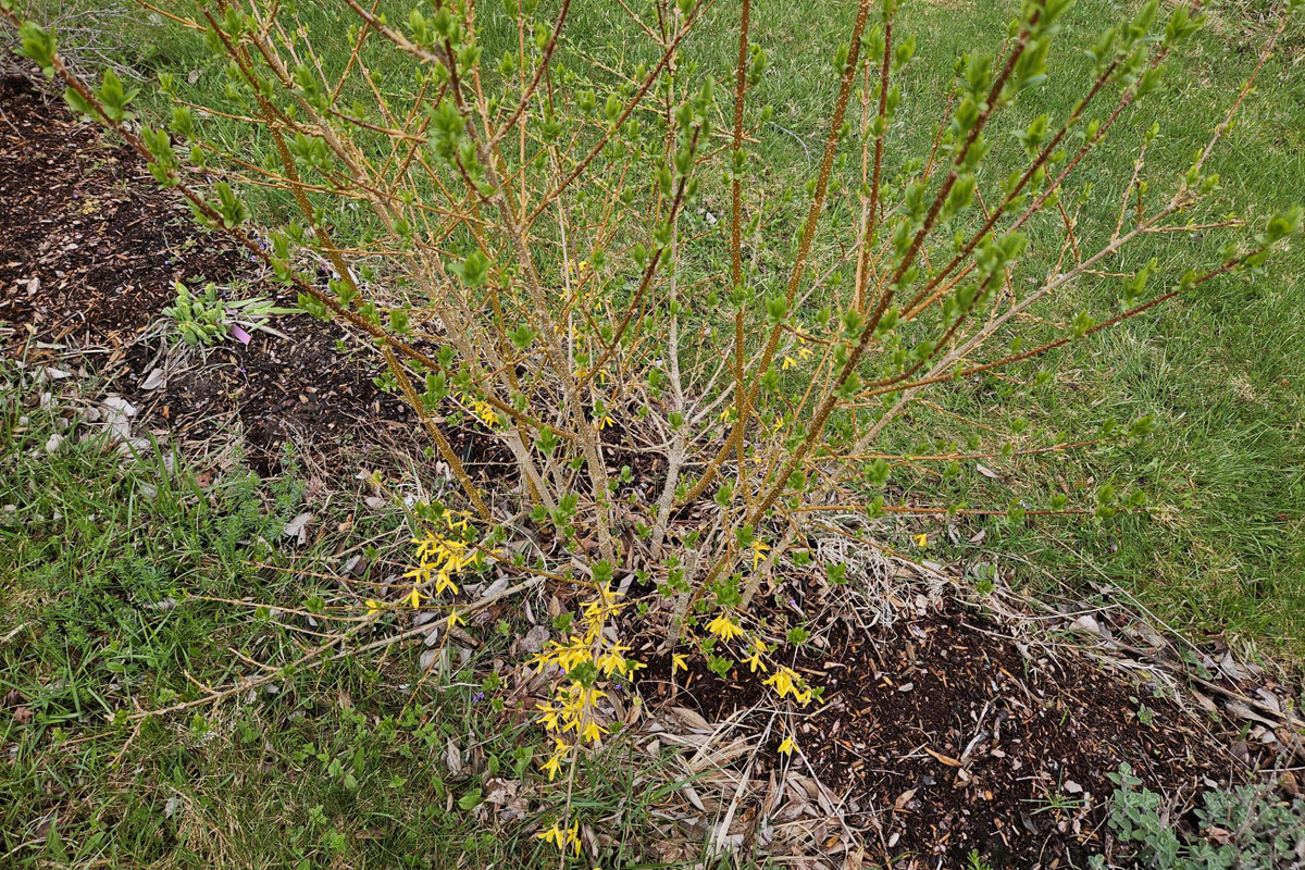 My other chilly day activity was pruning forsythia. To shape shrubs and encourage flowers in general, prune shrubs immediately after they bloom. Oddly, my forsythia didn’t bloom beyond the five or six branches around the base. They are still blooming, but the upper branches have no flowers. I suspect that our frigid February winds killed the flower buds because I had pruned the plants early last year to encourage more flower bud formation. When I look closely, I can see along the branches the buds that won’t open.