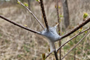 Speaking of pests, scout now for signs of tent caterpillars. I spotted this small tent on a sapling. A native pest, they can be unsightly and defoliate trees. Usually, a mature tree will not suffer long-term damage. But remove them from young plants. An easy way to control the caterpillars is to prune out the branch holding the tent and dispose of the tent, branch, and caterpillars in a garbage bag. Do not put in a compost pile!