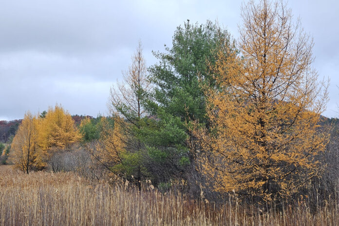 Among a few flashes of sunlight this November, I spotted some of my favorite trees, larches or Larix laricina. These conifers turn golden yellow then orange in November and lose their needles. In spring, the soft new foliage is a brilliant green. They grow best in wet, boggy meadows or pond edges. Sadly, I cannot put a tree in my wet, boggy areas. But I sure enjoy seeing them in November.