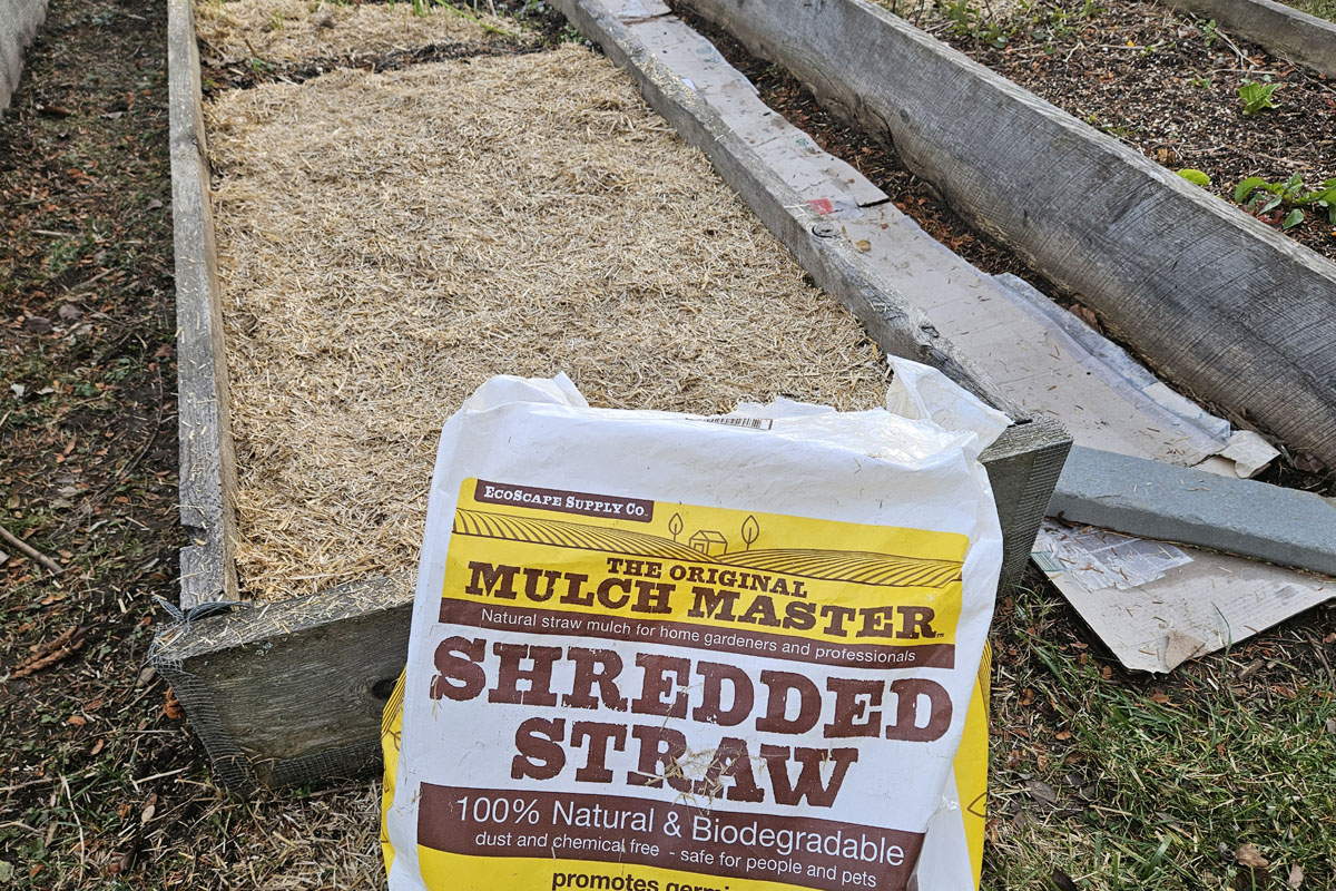 For the garlic, I put a two-inch layer down at first to retain moisture. I will add more in a couple weeks once the ground freezes solid. I use a bagged, shredded straw. It is easier for me to transport and quick to spread. I placed it on the bed before a day of rain so the rain set the straw in place. If no rain is forecast, I recommend watering the area to dampen the straw before winter winds have a chance to blow it away.