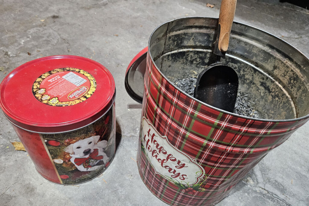 Install posts for bird feeders now before the ground freezes solid, but don’t put out birdseed yet if you have bears in your area. Once soils are frozen and snow flies, usually December, bears take to their dens for a couple months. Store birdseed in a tightly sealed container. I have found that popcorn tins (received as family gifts) or metal trash cans with a tight lid will keep the seed dry and mice out of the birdseed.