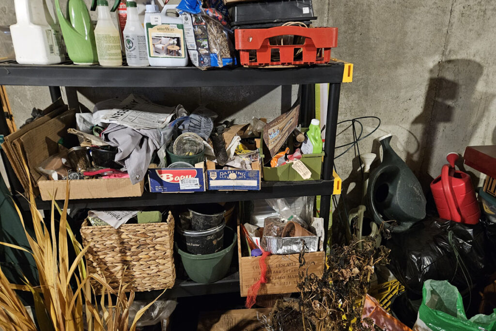 Clean wooden stakes with a wire brush before storing. I have sorted them by relative size and corralled them with a nursery pot. I have a section of my dry basement for all things gardening. It is not tidy yet. I will save that for a truly yucky winter day. For now, I am collecting all my reusables—stakes, pots, digging tools, bulbs, seeds, and pest solutions—on assorted shelves. When I do organize the mess, I will have a much better idea of what to toss, what to save, and what to buy new for next spring.