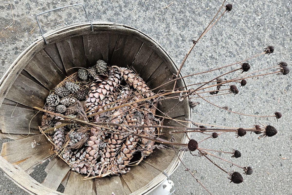 Collect pine cones and dried seed pods for seasonal decorations. I have white pine and a mugo pine with interesting cones. I also enjoy the stiff seed balls of black-eyed susans (Rudbeckia fulgida). I leave the larger Coneflower (Echinacea purpurea) seed heads because I have seen birds land on them and peck off the seeds.