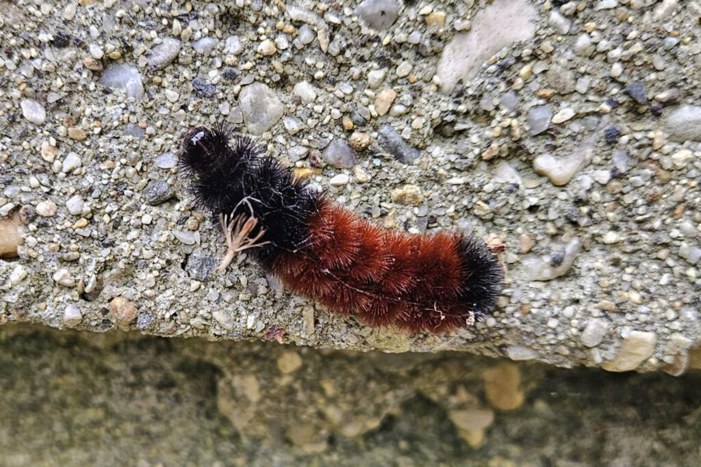 When you do get to those leaves, you will likely find a woolly bear caterpillar, the larva of an Isabella tiger moth (Pyrrharctia isabella). These ubiquitous caterpillars overwinter under leaves on garden edges. Their color bands do not predict the severity of our upcoming winter despite the myths. The width of the reddish brown band gets bigger as the caterpillar ages. Still, they are fun to find and are not venomous or a garden pest. Do be careful when holding as the hairs can cause dermatitis in some.