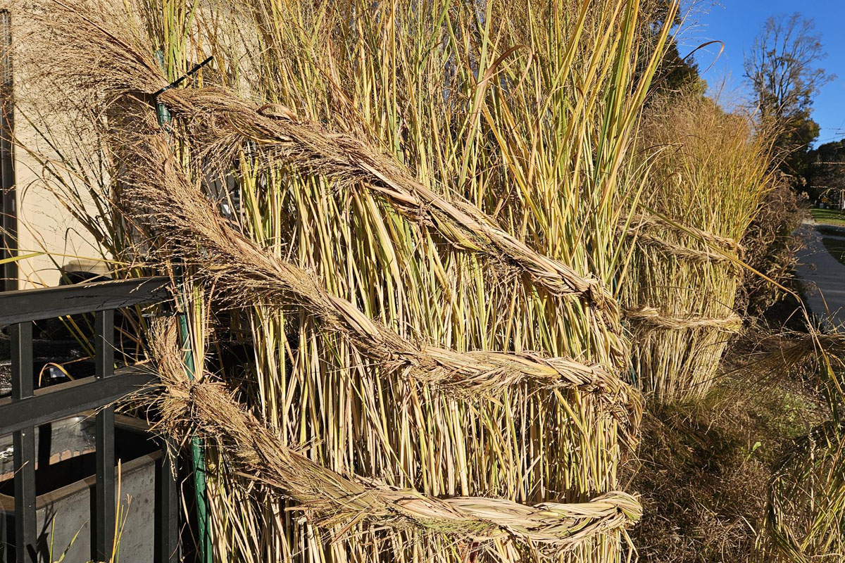 I love what staff at Ward’s Nursery have done to keep their ornamental grasses interesting and tidy. Eva and Garrett collaborated to gather and braid sections of the grass clumps. The braids work as a binding element. Garrett formed the braids from grass blades gathered at the base. Once he braided the blades, he wrapped the clumps with the braids and tied them off to a stake at the back. You could also gather the braids into an elaborate tuft. Beautiful and practical!