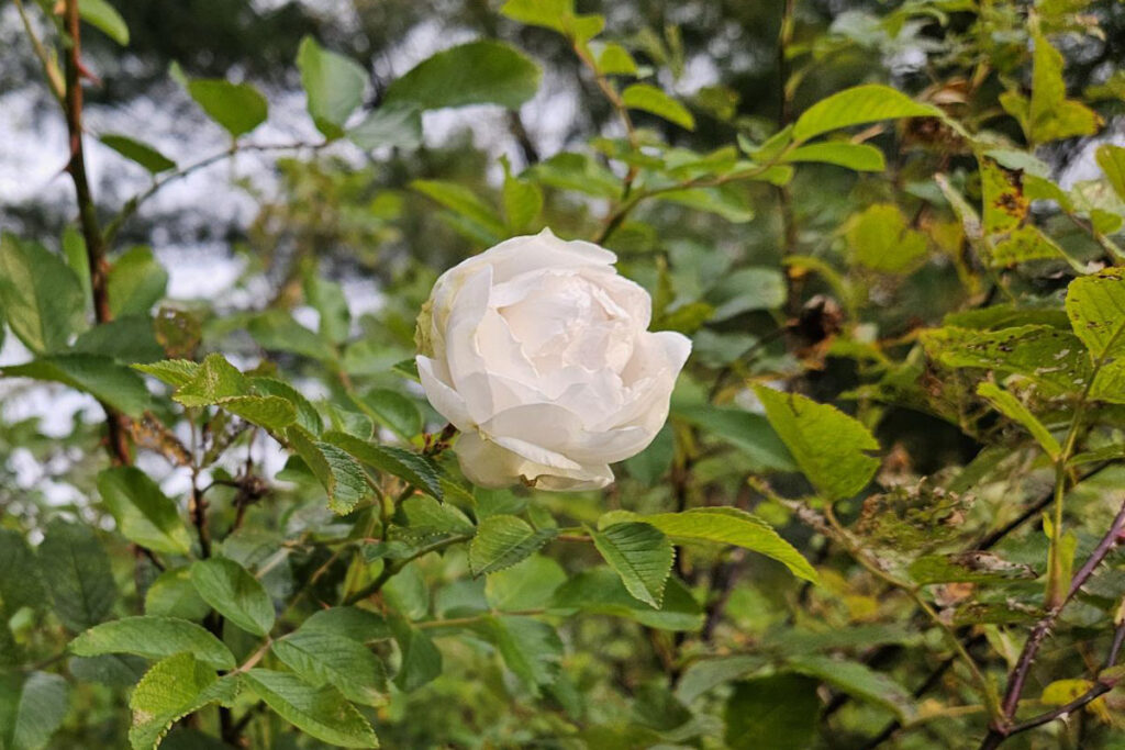 Finally, I had a surprise last week. My white rose bush rebloomed! This huge rose has been here for decades before me, but the beetles devoured it this past summer. Well, it persevered and the latest frost did not affect it a bit. Fresh buds have opened for a fall bloom. That is a happy reminder that roses do not need to be pruned back until spring. Prune them to shape and cut off any winter dieback when you see new growth, typically in April. Prune in fall and you just might miss a lovely flower!