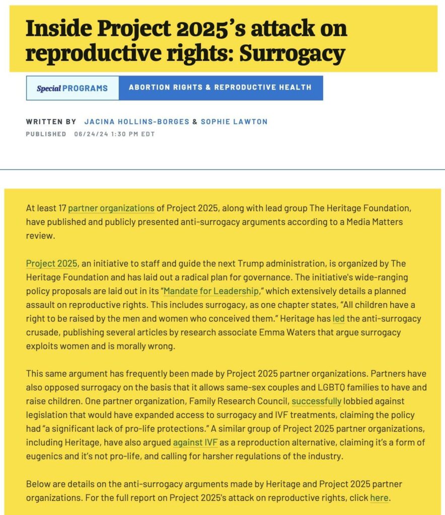 Media Matters offered this guide to what the many contributors to and adherents of Project 2025 said about surrogacy: