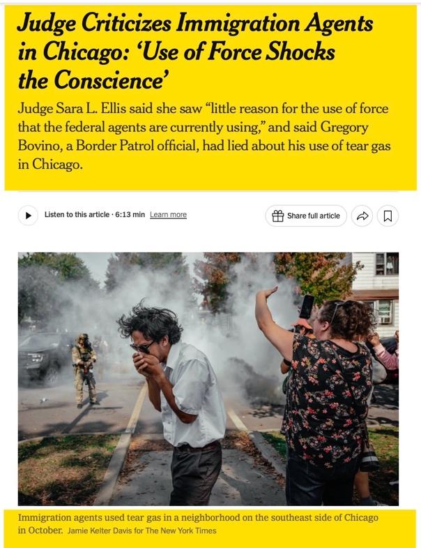 Judge Sara L. Ellis said she saw ‘little reason for the use of force that the federal agents are currently using,’ and said Gregory Bovino, a Border Patrol official, had lied about his use of tear gas in Chicago. …