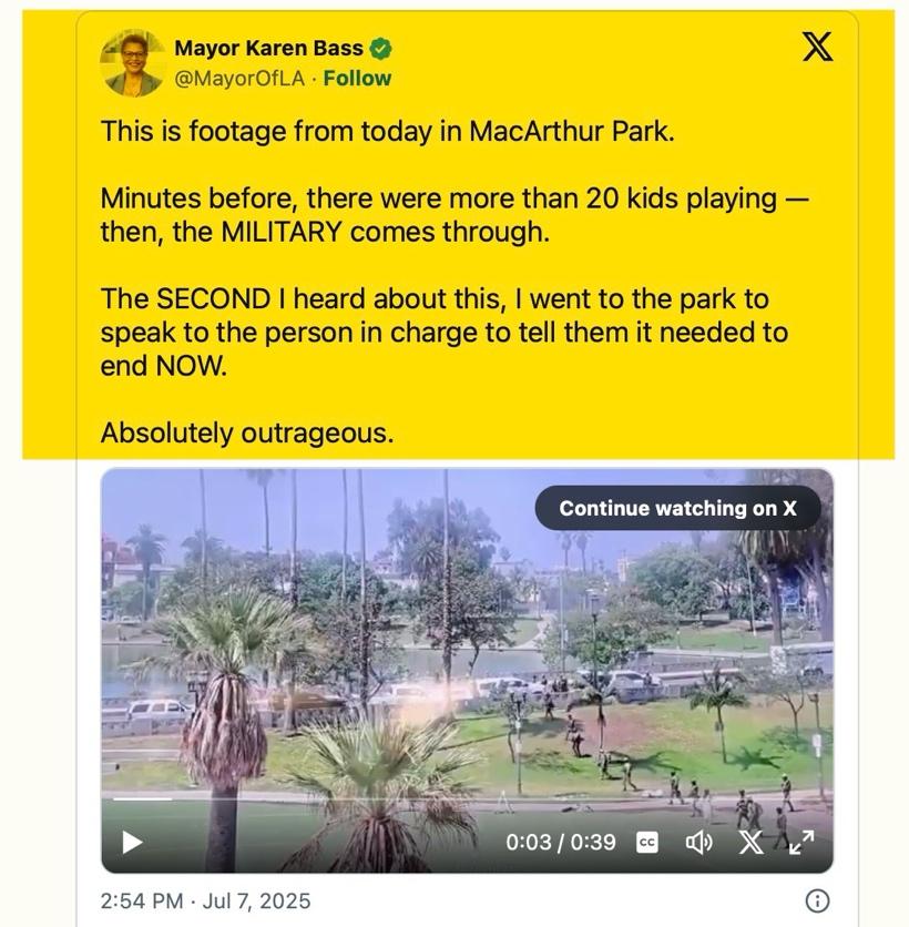 ‘What I saw in the park today looked like a city under siege, under armed occupation,’ said Mayor Bass, who told reporters there were children in the park attending a day camp.