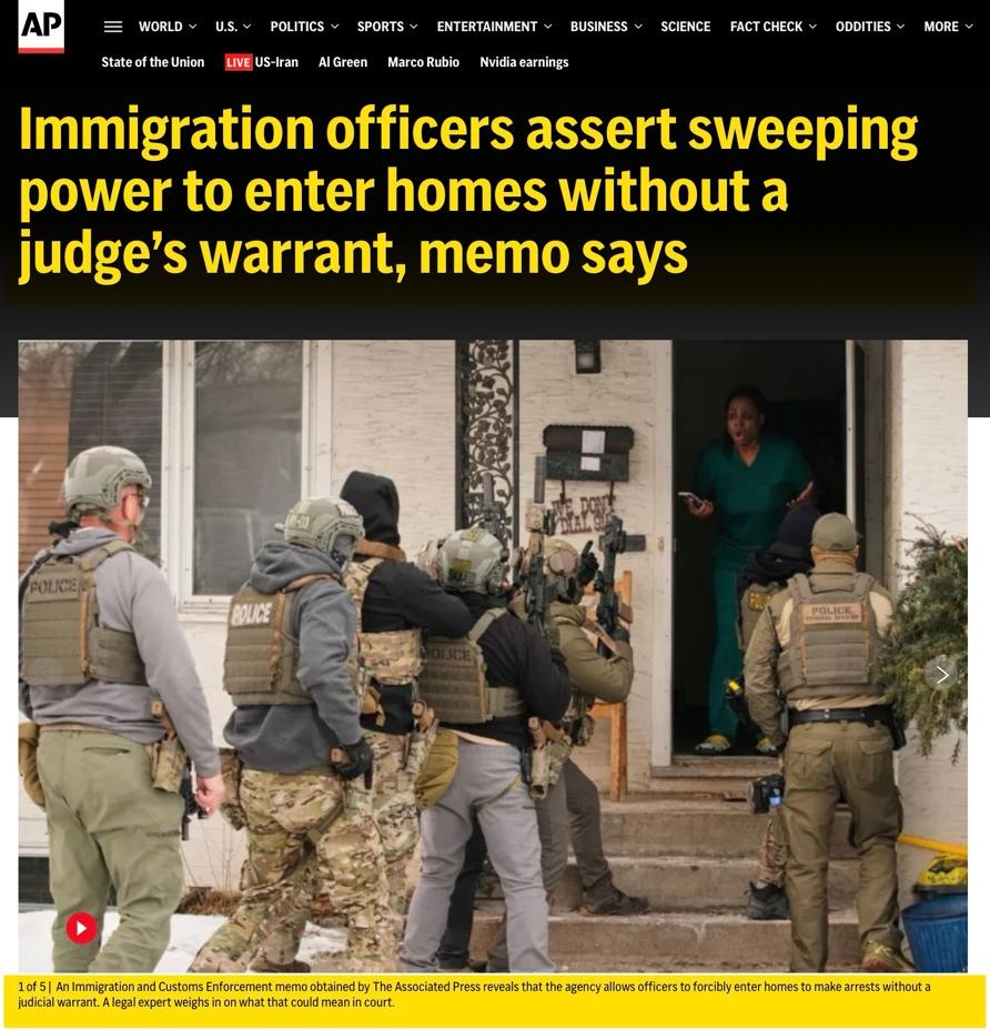 Federal immigration officers are asserting sweeping power to forcibly enter people’s homes without a judge’s warrant, according to an internal Immigration and Customs Enforcement memo obtained by The Associated Press, marking a sharp reversal of longstanding guidance meant to respect constitutional limits on government searches.