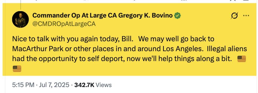 Then, again, Bovino asserted that ICE’s military-style roundups were the new normal for Los Angeles and America:
