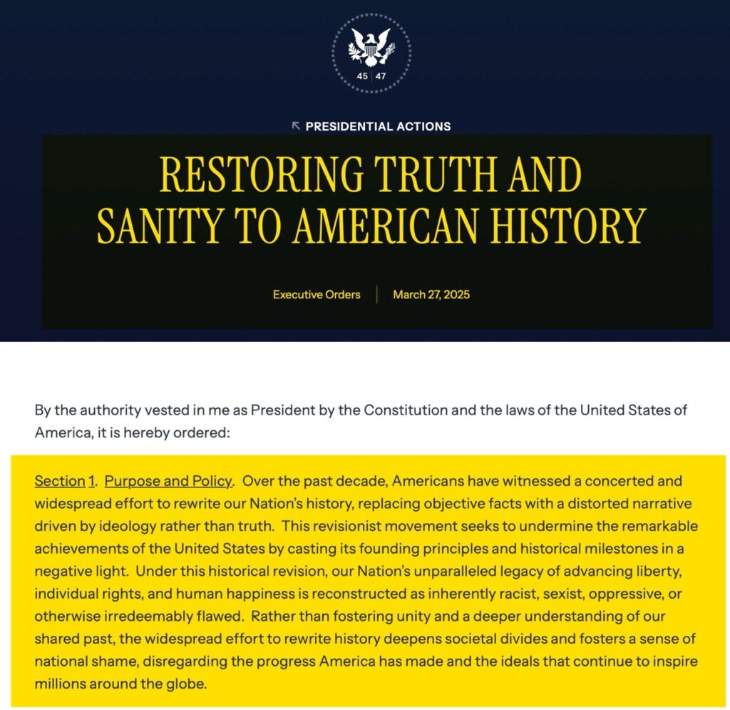 It is the policy of my Administration to restore Federal sites dedicated to history, including parks and museums, to solemn and uplifting public monuments that remind Americans of our extraordinary heritage, consistent progress toward becoming a more perfect Union, and unmatched record of advancing liberty, prosperity, and human flourishing. Museums in our Nation’s capital should be places where individuals go to learn — not to be subjected to ideological indoctrination or divisive narratives that distort our shared history. To advance this policy, we will restore the Smithsonian Institution to its rightful place as a symbol of inspiration and American greatness –- igniting the imagination of young minds, honoring the richness of American history and innovation, and instilling pride in the hearts of all Americans.