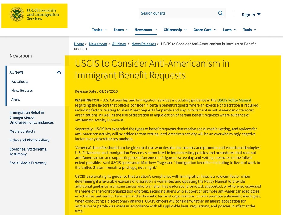 Separately, USCIS has expanded the types of benefit requests that receive social media vetting, and reviews for anti-American activity will be added to that vetting. Anti-American activity will be an overwhelmingly negative factor in any discretionary analysis. ‘America’s benefits should not be given to those who despise the country and promote anti-American ideologies. U.S. Citizenship and Immigration Services is committed to implementing policies and procedures that root out anti-Americanism and supporting the enforcement of rigorous screening and vetting measures to the fullest extent possible,’ said USCIS spokesman Matthew Tragesser. ‘Immigration benefits—including to live and work in the United States—remain a privilege, not a right.’