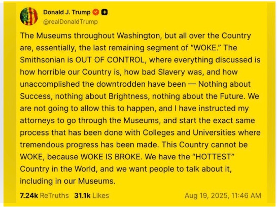 Mr. Trump made the comments a week after the White House told the Smithsonian that its museums would be required to adjust any content that the administration finds problematic in ‘tone, historical framing and alignment with American ideals’ within 120 days. Taken together, the administration’s examination and Mr. Trump’s post on Tuesday were the latest example of Mr. Trump trying to impose his will on a cultural institution and minimize the experiences and history of Black people in the United States.
