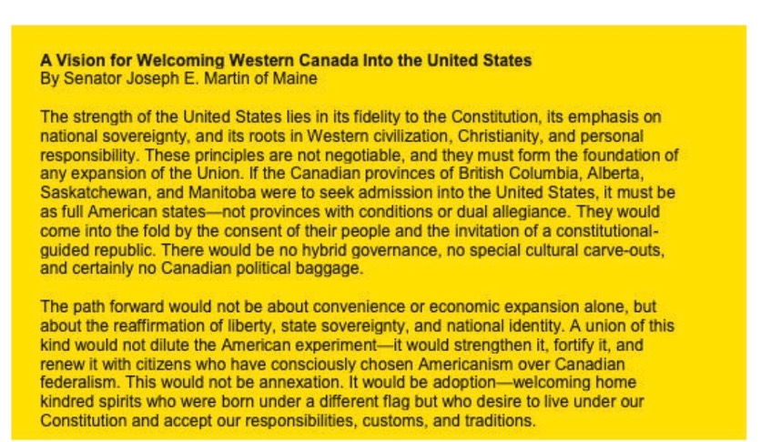 Martin goes on to state that Canadian provinces would, of course, have to give up their laws on “gun control, speech restrictions, crown lands, or religious education that conflict with American norms.” He then asserts. “For too long, Canadian citizens have been subject to an illusion of freedom administered through bureaucratic means.” And he brags, “In Canada, firearm ownership is subject to licensing, classification, and confiscation. In the United States, it is a constitutional right that shall not be infringed. Upon admission, residents of the new American states would have the same right to keep and bear arms as those in Texas, Florida, or Wyoming.”