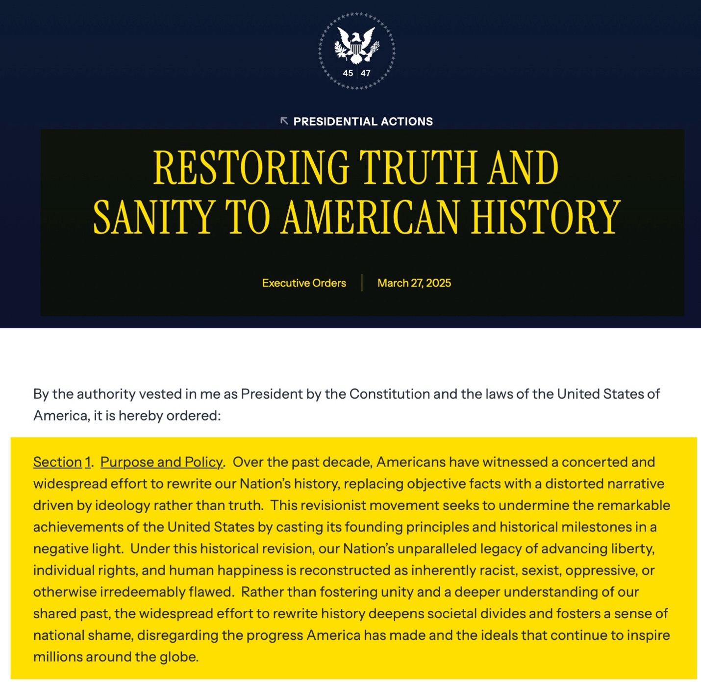It is the policy of my Administration to restore Federal sites dedicated to history, including parks and museums, to solemn and uplifting public monuments that remind Americans of our extraordinary heritage, consistent progress toward becoming a more perfect Union, and unmatched record of advancing liberty, prosperity, and human flourishing. Museums in our Nation’s capital should be places where individuals go to learn — not to be subjected to ideological indoctrination or divisive narratives that distort our shared history. To advance this policy, we will restore the Smithsonian Institution to its rightful place as a symbol of inspiration and American greatness –- igniting the imagination of young minds, honoring the richness of American history and innovation, and instilling pride in the hearts of all Americans.