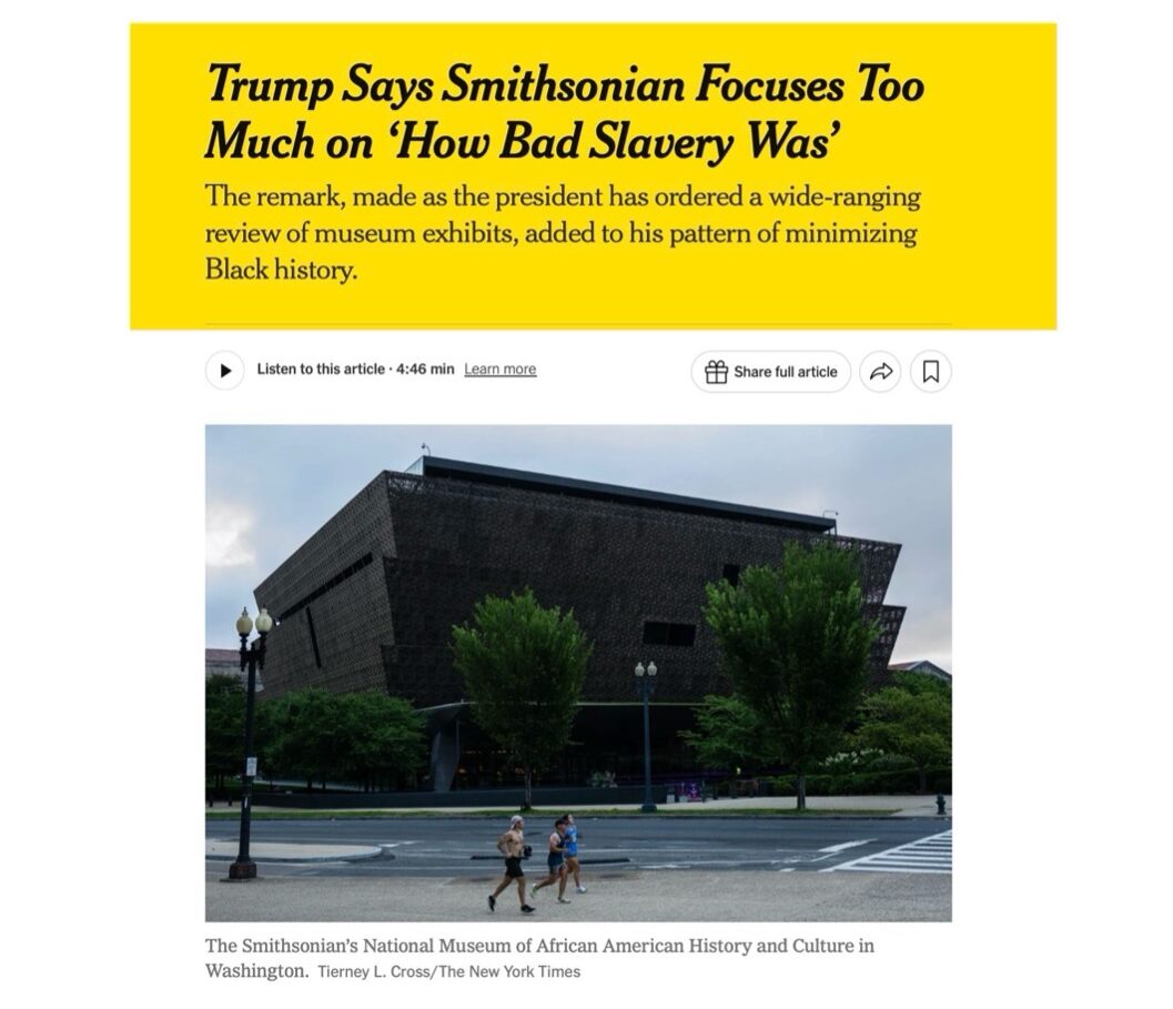 Mr. Trump made the comments a week after the White House told the Smithsonian that its museums would be required to adjust any content that the administration finds problematic in ‘tone, historical framing and alignment with American ideals’ within 120 days. Taken together, the administration’s examination and Mr. Trump’s post on Tuesday were the latest example of Mr. Trump trying to impose his will on a cultural institution and minimize the experiences and history of Black people in the United States.