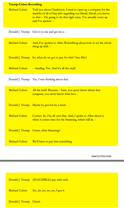 And three months before Election Day, AMI and McDougal signed that deal. But as the weeks dragged on and the defendant hadn’t yet made good on his agreement to pay AMI back, Pecker started getting antsy … So, to show Pecker that Trump really did plan to pay AMI back for the McDougal payoff, Cohen used his cell phone to record a conversation with Donald Trump in September of 2016 … Cohen tells the defendant that he spoke to Allen Weisselberg, who is the Trump Organization Chief Financial Officer, about how to set the whole thing up … You will hear him ask Cohen: So what do we got to pay for this? One-fifty? You will even hear Mr. Trump … suggest paying in cash. (Emphasis added.)