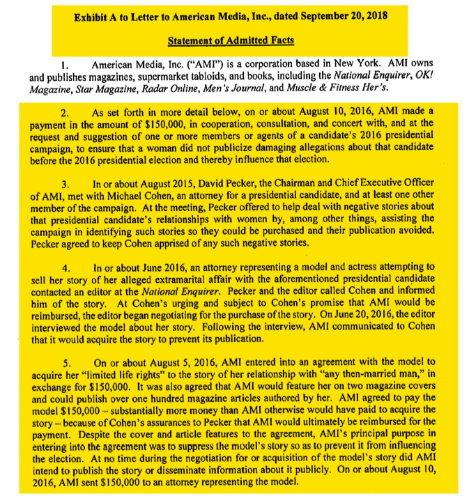 Q: Can we put up … part of the Statement of Admitted Facts that AMI entered into with the Southern District of New York … did AMI say in this document that AMI’s principal purpose in entering into the agreement was to suppress the model’s story so as to prevent it from influencing the election?