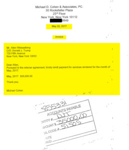 When President Trump became President, when he took the Office of the Presidency in 2017, in January, Michael Cohen, who you heard the People allude to, assumed the role of President Trump’s personal attorney. And … each month in 2017, Michael Cohen sent an invoice to some of the employees at the Trump — at the Trump Tower … for $35,000. And on this invoice, Michael Cohen described his work as “payment to the retainer agreement for legal services rendered.