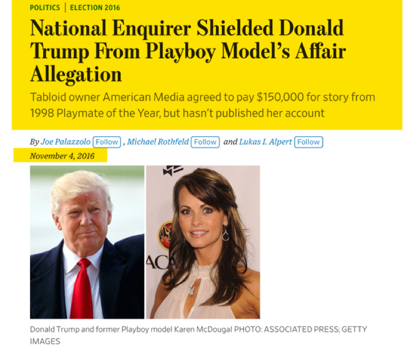 Q: Directing your attention to November 4, 2016, did you become aware that the Wall Street Journal published an article that day revealing aspects of the Karen McDougal’s story?