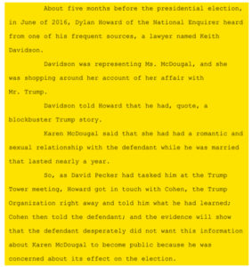 One day after the Access Hollywood tape was released, Dylan Howard, he’s the National Enquirer’s Editor-in-Chief, told David Pecker that another woman had come forward with the claim of a sexual encounter that she had had with the defendant while he was married. That woman was an adult film actress, a porn star named Stormy Daniels … Howard got in touch with Michael Cohen at the Trump Organization immediately … He connected him with Stormy Daniels’ lawyer Keith Davidson, the same lawyer who had represented Karen McDougal. And Cohen then discussed the situation with Trump, who was adamant that he did not want the story to come out …
