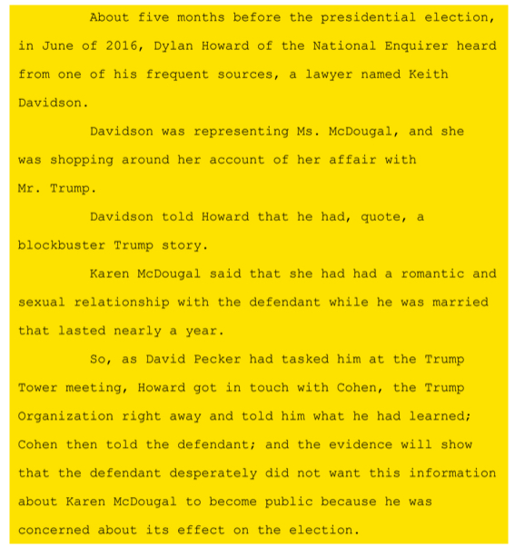 [Michael] Cohen asked AMI to make arrangements to buy McDougal’s information quickly so they could prevent anyone else from publishing it. Trump and Pecker and Cohen … had a series of conversations and discussions about who would put up the money for that payoff deal. Pecker ultimately agreed that he would have AMI make a $150,000 payment to McDougal in exchange for the limited life rights to the story of her affair.