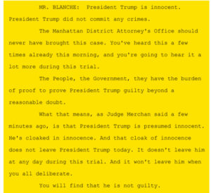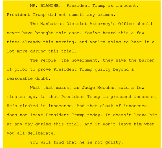 Next, Donald Trump attorney Todd Blanche offered an alternative explanation in his opening: Donald Trump was innocent.