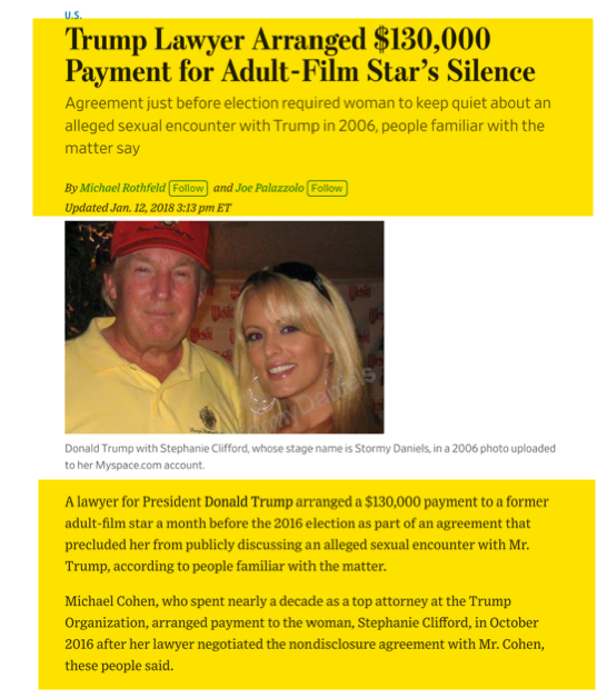 Q: … Did another article come out in The Wall Street Journal in January of 2018, in which the press publicly reported that Michael Cohen paid Stormy Daniels not to discuss her sexual relationship with Mr. Trump?