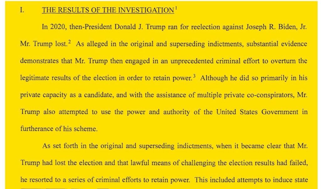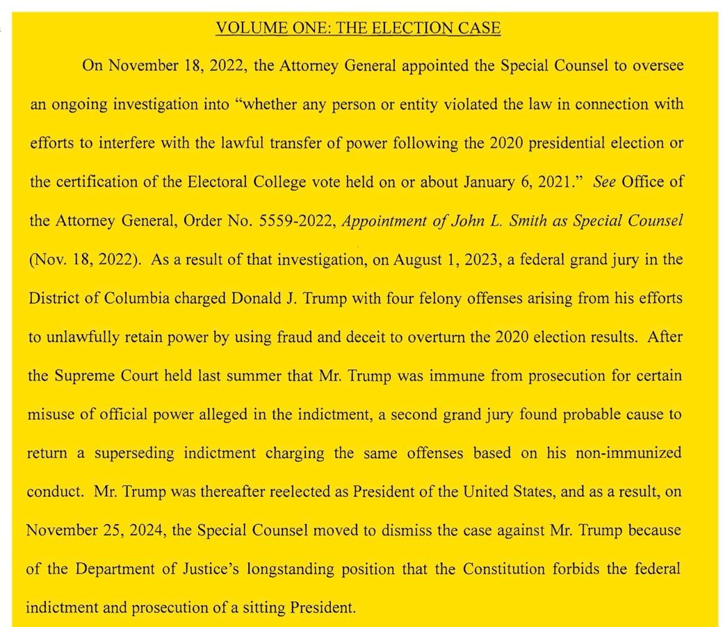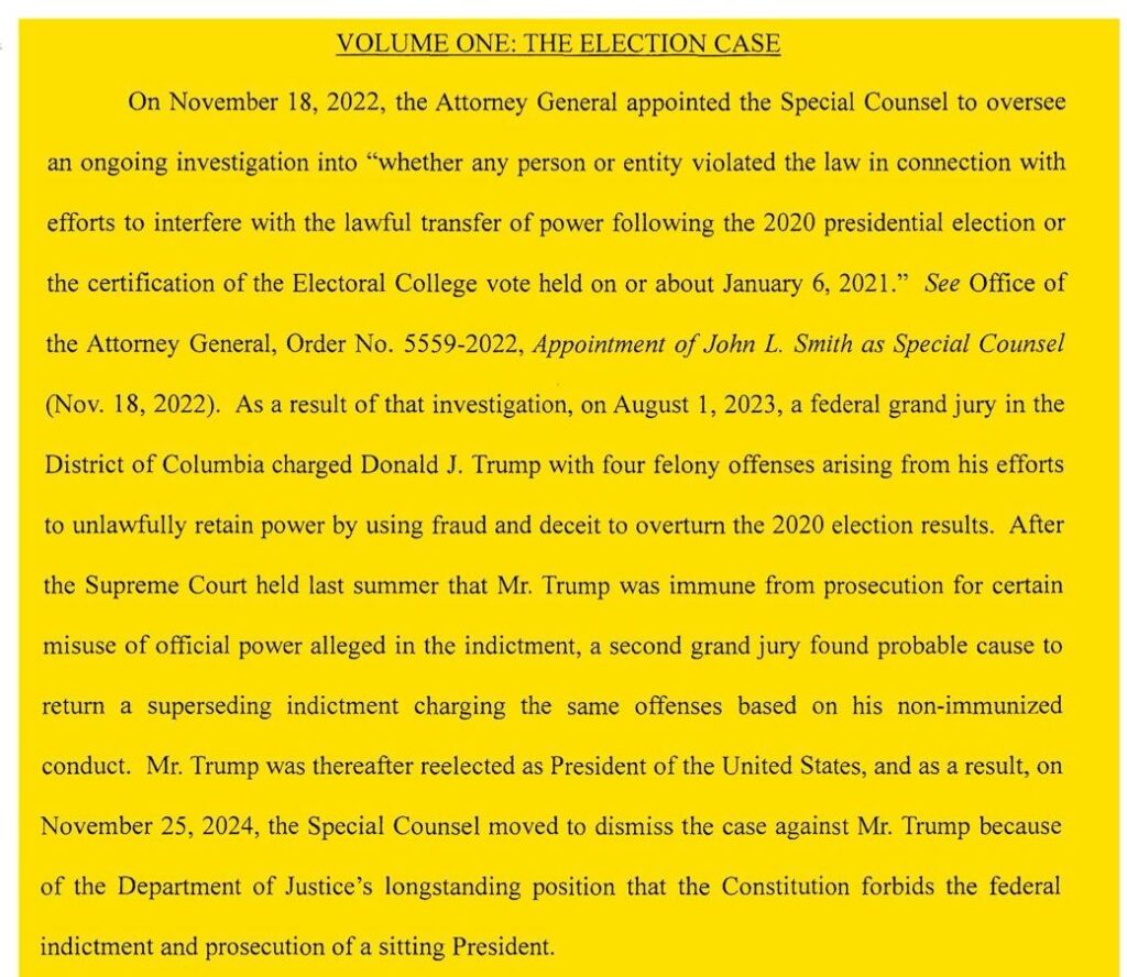 As a reminder, here are two excerpts from Jack Smith’s “Final Report on the Special Counsel’s Investigations and Prosecutions: Volume One, The Election Case”: