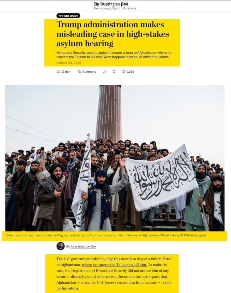 Since America’s 20-year war ended, some 200,000 Afghans have found refuge in the U.S. Many braved extraordinary danger for the U.S. The Trump administration has dismantled programs created to assist them, canceling humanitarian parole and other protections that allowed Afghan allies to remain while their cases were processed. Without those safeguards, many could be sent back to a regime so brutal and repressive the U.S. refuses to recognize it. Even Afghans forced to return from countries other than the U.S. have suffered. A July United Nations report details ‘cruel, inhuman or degrading treatment or punishment, enforced disappearance or other irreparable harm.’