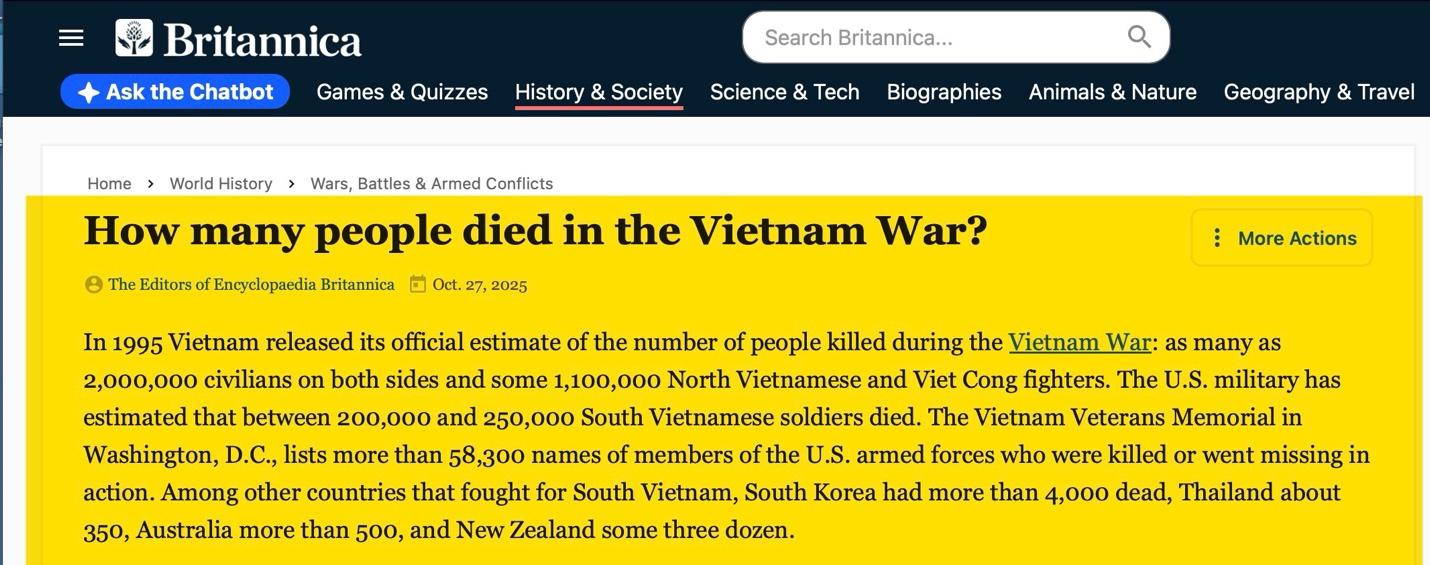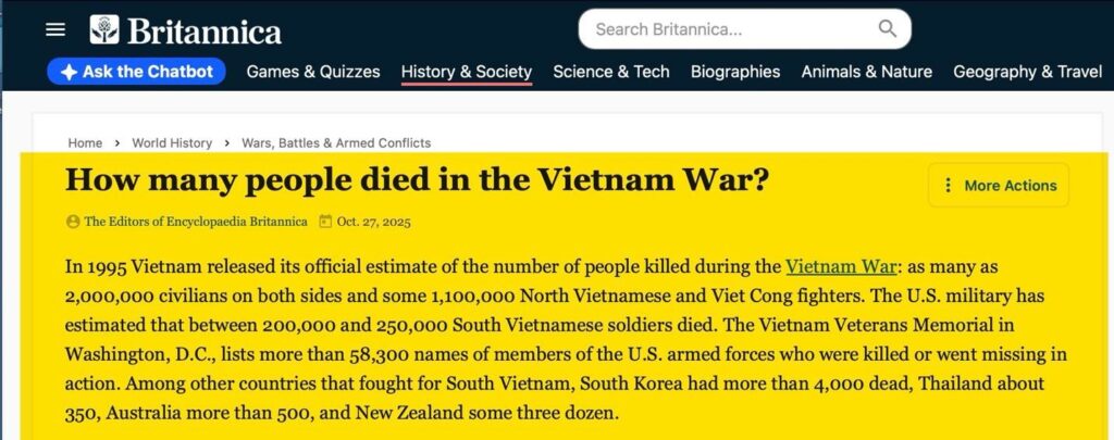 The Encyclopedia Britannica reveals what a great price the Vietnamese, the United States, and our allies and the neighboring countries of Southeast Asia paid for such stupidity.