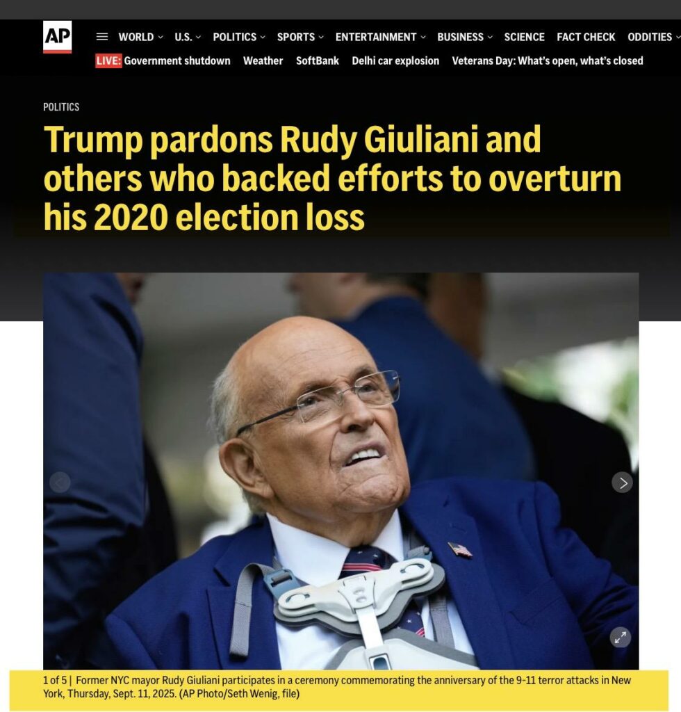 President Donald Trump has pardoned his former personal lawyer Rudy Giuliani, his onetime chief of staff Mark Meadows and others accused of backing the Republican’s efforts to overturn the 2020 election … The move, however, underscores Trump’s continued efforts to promote the idea that the 2020 election was stolen from him even though courts around the country and Trump’s own attorney general at the time found no evidence of fraud that could have affected the outcome. Reviews, recounts and audits of the election in the battleground states where Trump contested his loss also affirmed Biden’s victory.