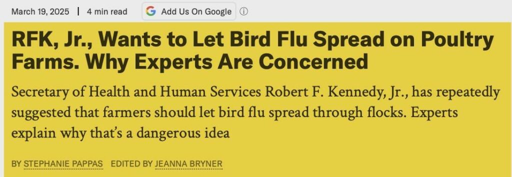 In an article titled “RFK Jr.’s Faulty Advice On Bird Flu,” Factcheck also weighed in: “