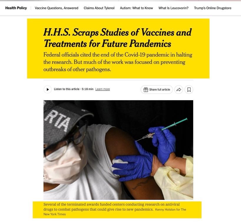 The Trump administration has canceled funding for dozens of studies seeking new vaccines and treatments for Covid-19 and other pathogens that may cause future pandemics. The government’s rationale is that the Covid pandemic has ended, which ‘provides cause to terminate Covid-related grant funds,’ according to an internal N.I.H. document viewed by The New York Times.