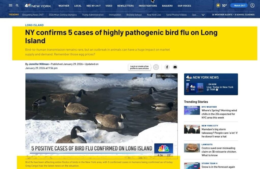 Bird-to-human transmission remains rare, but an outbreak in animals can have a huge impact on market supply and demand. Remember those egg prices? The New York State Department of Environmental Conservation (DEC) announced Thursday that it had five preliminary positive cases of highly pathogenic avian influenza, or bird flu, in Suffolk County. More dead birds across Long Island await testing.