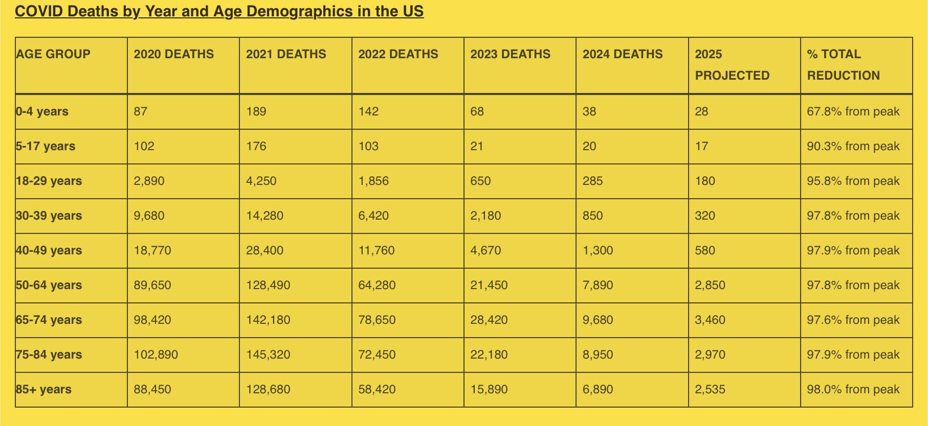 While there is no denying their assertion that it was the aged and infirm who were most at risk, they substantially underestimated the vulnerability of the rest of the population. The following chart from Global Statistics breaks down death by age group—revealing how the young and middle-aged alike succumbed—but also so very clearly reveals the success of medical intervention, the COVID-19 vaccine, and the active measures taken by citizens that reduced the death rate over time: