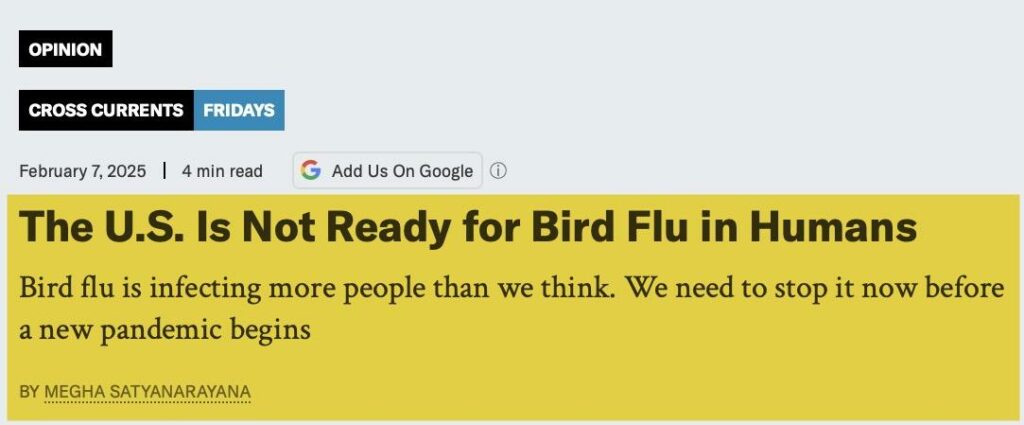 We’ve seen this movie before. Millions of people have died in the COVID pandemic that began under Trump’s watch. The Biden administration missed key opportunities to stop bird flu’s spread. As a nation, we still have not recovered from the physical, mental and social toll of COVID. What will happen if bird flu starts coursing through us?