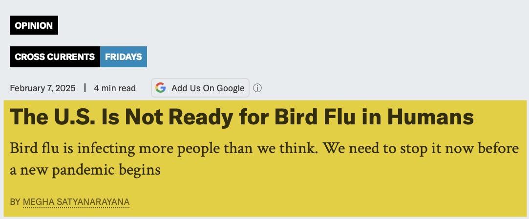 On the surface, this might seem like a small thing compared to the drama unfolding over tariffs, immigration, the firings of inspectors general and whatever new, egregious thing Elon Musk is doing without congressional approval. But this report matters. The H5N1 bird flu virus has been on the warpath since 2022, infecting chickens, cows, wild birds and now pigs, ducks, cats and several other animals.